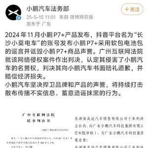 2024年11月小鹏P7+产品发布,抖音平台名为“长沙小莫电车”的账号发布小鹏P7+采用软包电池包的谣言并诋毁小鹏P7+商品声誉。广州互联网法院就该网络侵权案件作出判决,认定其侵害了小鹏汽车的名誉权,判决其向小鹏汽车书面赔礼道歉,并赔偿经济损失。小鹏汽车坚决捍卫品牌和产品的声誉,将持续打击散布传播不实信息、蓄意造谣抹黑的行为。(罗宁)
