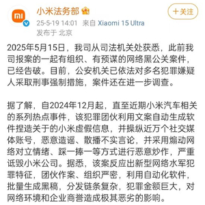 小米法务部称,据了解,自2024年12月起,直至近期小米汽车相关的系列热点事件,该犯罪团伙利用文案自动生成软件捏造关于的小米虚假信息,并操纵近万个社交媒体账号,恶意造谣、散播不实言论,并采用煽动网络对立情绪、踩一捧一等方式进行恶意炒作,严重诋毁小米公司。据悉,该案反应出新型网络水军犯罪特征,团伙作案、组织严密,利用自动化软件,批量生成黑稿,分发链条复杂,犯罪金额巨大,对网络环境和企业商誉造成极其恶劣的影响。