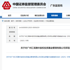 广东证监局网站消息,5月20日,广东证监局发布公告,对广州汇垠澳丰股权投资基金管理有限公司采取出具警示函的行政监管措施。