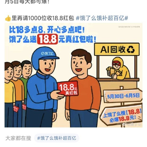饿了么发文称,比18多点8,开心多点吧,“真听劝,真发券,饿了么送18.8元真红包。”5月30日-6月5日每天都可爆。