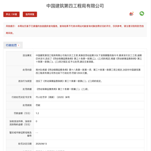 近日,信用中国(陕西)官网发布行政处罚信息,中国建筑第四工程局有限公司因拖欠员工工资,逾期仍未支付,被高新区劳动监察大队罚款12000元。