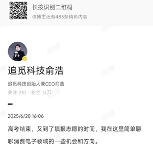 新浪科技讯 6月20日晚间消息,追觅科技创始人兼CEO俞浩在高考结束之际,谈到了对消费电子未来方向的看法:“宏观上,我始终认为未来的发展格局将演变为,依托全球资源,中国研发、本土制造、最终面向全球市场消费这样的一个模式,这也是年轻一代未来的重大机会点。