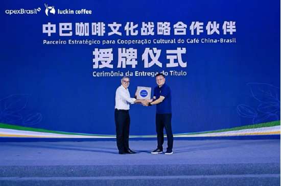 开工仪式当天,瑞幸首届中巴咖啡文化沙龙举行,瑞幸、厦门市金砖办与巴西方围绕咖啡贸易与文化交流展开对话。同时,巴西出口投资促进局(Apex Brasil)主席若热·维亚纳向瑞幸咖啡联合创始人、首席执行官郭谨一授牌“中巴咖啡文化战略合作伙伴”,以表彰瑞幸咖啡在中巴经贸合作及文化交流领域的突出贡献。