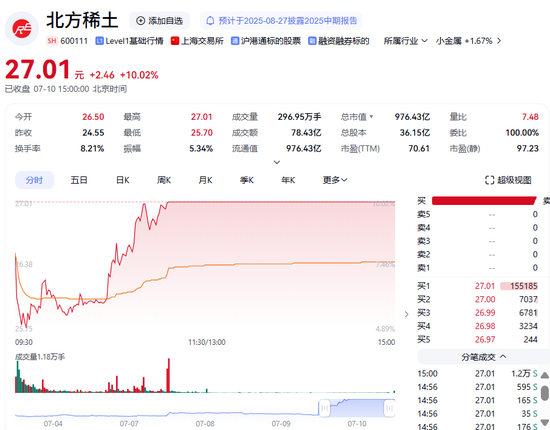 受业绩大幅预增影响,北方稀土今日强势涨停,总市值逼近1000亿元。