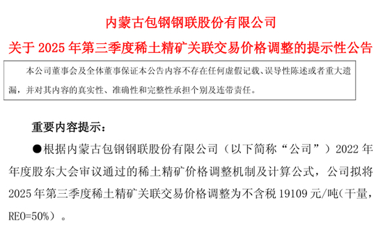 7月10日晚间,北方稀土、包钢股份双双公告,拟将2025年第三季度稀土精矿关联交易价格调整为不含税19109元/吨(干量,REO=50%,下同),REO每增减1%、不含税价格增减382.18元/吨。