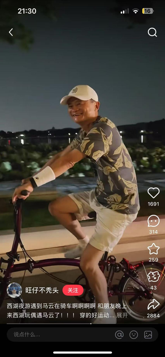7月17日晚,有网友在小红书发文称在西湖边偶遇马云。一身休闲装扮的马云,骑着一辆单车,表情轻松,笑容满面。