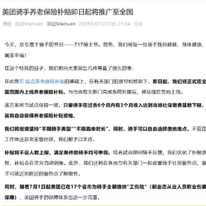 美团正式全面上线骑手养老保险补贴,补贴不设人数上限