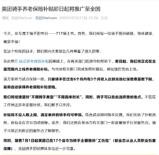 7月17日,美团官方公众号发文称,在其此前试点养老保险补贴的基础上,17日起,美团将正式在全国范围内上线养老保险补贴。与当地有关部门完成系统对接后,将陆续在各地上线。