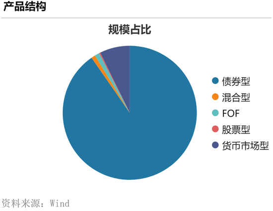从该公司产品结构来看,债券型和货币型基金规模占比分别为90.48%和7.27%,固收类产品占比接近98%,而混合型和股票型基金规模占比分别仅为0.97%和0.13%。