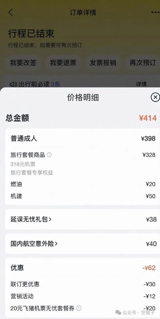 有了优惠券,为什么还要比基础票价贵?朱先生以为自己误触了其他服务,遂取消预定重新下单。这次,朱先生仔细查看了自己勾选的每一项服务,能不选的都不选,但是价格依然是414元。