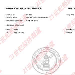 据21世纪经济报道,7月21日,记者从英属维京群岛金融服务委员会查询得知,娃哈哈争产案第二被告Jian Hao Ventures Limited(建昊企业有限公司)的唯一董事为宗馥莉。该决议及同意任职书最后存档的日期为2024年3月7日。