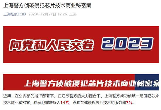 2023年12月,上海警方发布通报表示,在公安部的指挥部署下,在江苏警方的大力配合下,成功侦破一起侵犯芯片技术的商业秘密案,抓获犯罪嫌疑人14名,查扣存储侵权芯片技术的服务器7台。在通报中,仅以“权利公司”代指华为,而此次判决首次正式确认了涉案双方的具体信息。