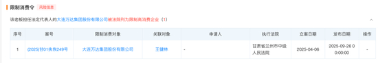 据天眼查,大连万达集团股份有限公司(以下简称万达集团)及其法定代表人王健林等被限制高消费,时间为2025年9月26日。