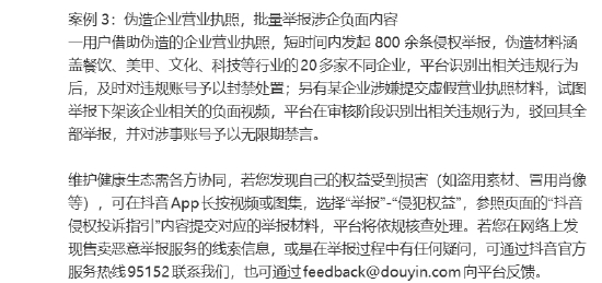 一用户借助伪造的企业营业执照,短时间内发起 800 余条侵权举报,伪造材料涵盖餐饮、美甲、文化、科技等行业的20多家不同企业,平台识别出相关违规行为后,及时对违规账号予以封禁处置;另有某企业涉嫌提交虚假营业执照材料,试图举报下架该企业相关的负面视频,平台在审核阶段识别出相关违规行为,驳回其全部举报,并对涉事账号予以无限期禁言。