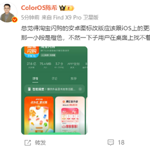 12月5日消息,OPPO ColorOS 设计总监@ColorOS陈希 发微博评价淘宝闪购的安卓图标:总觉得淘宝闪购的安卓图标改版应该跟iOS上的更新策略一样。主体是蓝色,底下那一小段是橙色,不然一下子用户在桌面上找不着了。