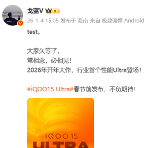 1月4日,iQOO产品经理“戈蓝V”发文正式宣布,品牌开年大作 iQOO 15 Ultra 将于春节前发布,被定位为“行业首个性能Ultra”的机型。在其公布的新机预热海报中,明确标注了“春节前见”。