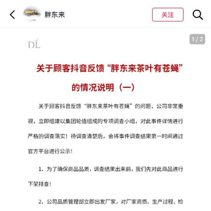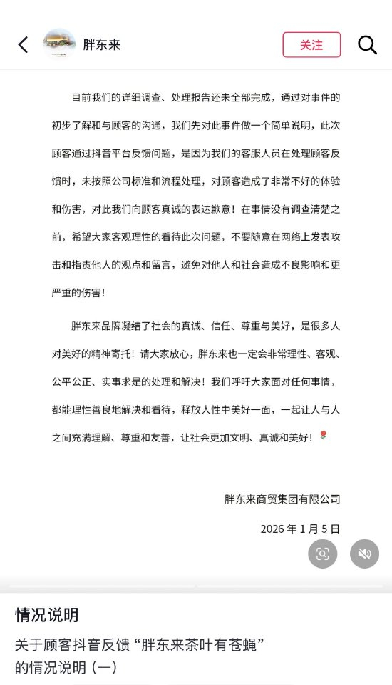 1月5日,胖东来发布《关于顾客抖音反馈“胖东来茶叶有苍蝇”的情况说明(一)》。