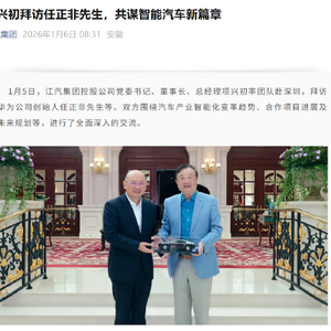 1月5日,江汽集团控股公司党委书记、董事长、总经理项兴初率团队赴深圳,拜访华为公司创始人任正非先生等。双方围绕汽车产业智能化变革趋势、合作项目进展及未来规划等,进行了全面深入的交流。