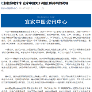 1月7日,宜家中国发问宣布,自2026年2月2日起停止运营包括宜家上海宝山商场、宜家广州番禺商场、宜家天津中北商场、宜家南通商场、宜家徐州商场、宜家宁波商场和宜家哈尔滨商场在内的七个线下触点。当地顾客仍可通过所在城市(例如上海、广州、天津)的其他宜家商场或宜家官网、宜家APP、宜家微信可购物小程序、天猫旗舰店及京东旗舰店等全渠道继续体验宜家产品和服务。