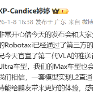 1月8日,小鹏汽车自动驾驶产品高级总监@XP-Candice婷婷 发文介绍小鹏Robotaxi的进展:搭载小鹏第二代VLA 的Robotaxi已经通过了第三方的场地测试,即将开始公开道路测试。