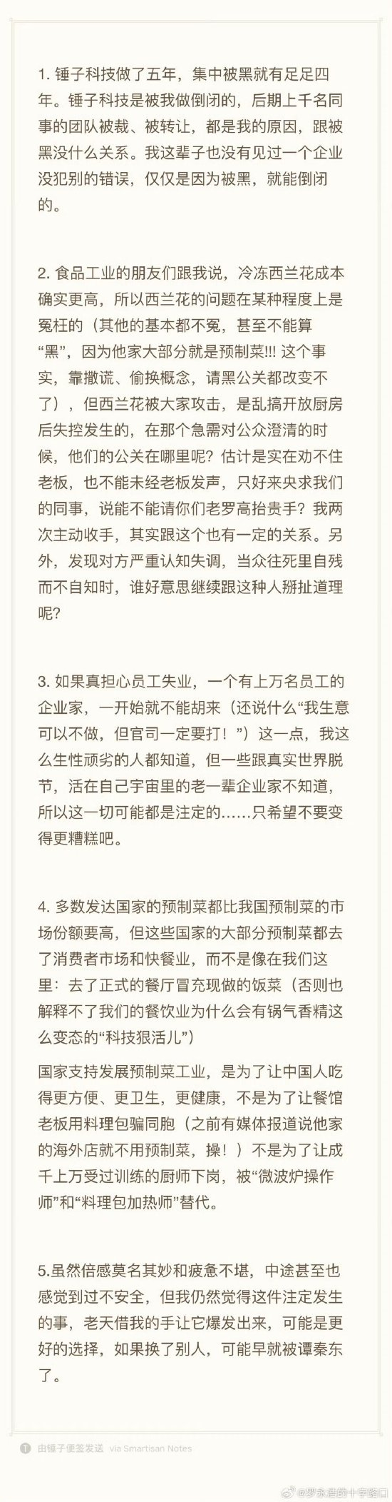 他谈到,食品工业的朋友们跟我说,冷冻西兰花成本确实更高,所以西兰花的问题在某种程度上是冤枉的(其他的基本都不冤,甚至不能算“黑”,因为他家大部分就是预制菜!!! 这个事实,靠撒谎、偷换概念,请黑公关都改变不了),但西兰花被大家攻击,是乱搞开放厨房后失控发生的,在那个急需对公众澄清的时候,他们的公关在哪里呢?估计是实在劝不住老板,也不能未经老板发声,只好来央求我们的同事,说能不能请你们老罗高抬贵手?我两次主动收手,其实跟这个也有一定的关系。另外,发现对方严重认知失调,当众往死里自残而不自知时,谁好意思继续跟这种人掰扯道理呢?