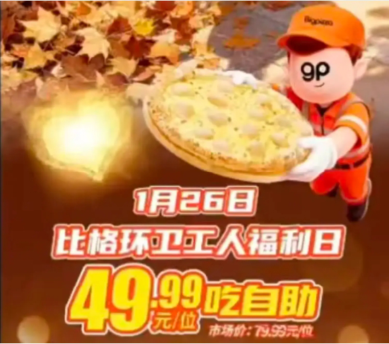 近期,比格比萨因49.99元“环卫工人福利日”优惠活动导致的争议,侧面折射出了这一问题。据比格比萨近期发布宣传海报,1月26日国际清洁能源日当天,环卫工人凭工作证或身着工作服到店,可享49.99元/位的自助优惠,市场价为79.99元/位。