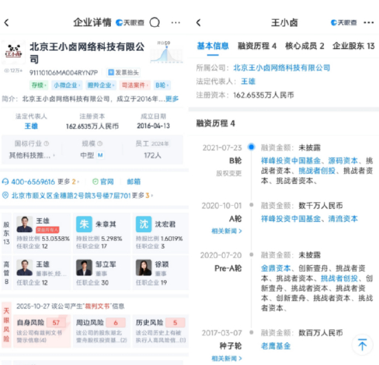 天眼查App显示,北京王小卤网络科技有限公司成立于2016年,是一家以从事科技推广和应用服务业为主的企业,已于2021年完成了B轮融资,背后不乏包括挑战者资本、源码资本、祥峰投资中国基金等明星机构。