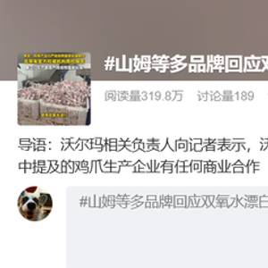 漂白鸡爪事件曝光后,3月15日晚到16日上午,多家鸡爪相关企业急忙发声撇清,包括有友食品、邹三和、王小卤等品牌均公开表示未使用双氧水,并确保产品安全。3月15日,沃尔玛中国就3.15晚会鸡爪产品相关报道回应称:“山姆与沃尔玛坚持严苛的食品安全标准,我们从未与3.15报道中提及的鸡爪生产企业有任何商业合作,全线在售商品均符合国家食品安全标准,请消费者放心购买。”