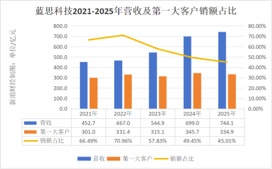 年报显示,2025年海外营收409.55亿元,其中排名第一的客户贡献了334.91亿元营收,全年销售占比高达45.01%。而这一客户,正是苹果。《BUG》栏目统计发现,2021年—2025年,苹果在蓝思科技年销售额中的占比虽然一路持续下降,但长期高于50%,可谓占据“半壁江山”。