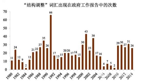 在这一方面,电力改革和产业结构调整之间的关系也需要纳入讨论。一直以来,产业结构调整都是政府施政的主轴之一。在历年的政府工作报告中,我们发现,“结构调整”这个词首次出现在1980年代,最多的是1991年,出现了66次。2010年以来这个词又开始密集出现。显然,结构调整几十年来都是党中央国务院的重要政策目标。应该说,结构调整的重要性应该在电改之上。至少,电改的政策目标不应该和这个政策目标有太大的冲突。