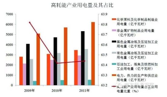 所谓的结构调整,其目标之一就是降低高耗能产业的比重。两个指标可以说明这一问题的重要性。一是高耗能产业用电量占工业用电量的比重大体维持在63%左右。
