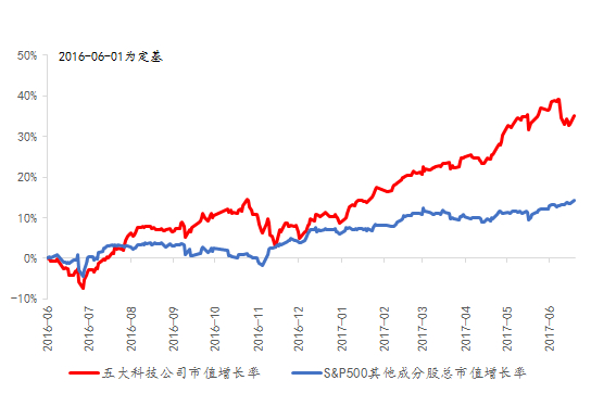再看S&P500,它上涨的驱动主要靠五大科技巨头的市值增加,特别是最近的4个月五大科技巨头市值增加了2600亿美元,而其他495家S&P成分股市值却缩水了2600亿美元。