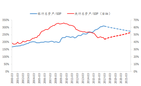 第一是新老划断式的金融监管,看上去是温柔一刀,恰恰将产生更加绵长、更可持续的信用收缩的效果。过去几年为什么我们要做那么多金融创新,做那么多金融交易结构,把金融内部的表做得那么大,其实根本的原因就是我前面已经讲过的传统经济,底层资产越来越差。7个瓶子5个盖,有2个瓶子没盖的话,面临的就是要暴露最近四五年的金融自由化的繁荣,简单来讲,就是因为盖不住,庞氏的链条要断,所以我们要用金融手段造2个金融虚拟的盖,让它不要水落石出。今天要搞新老划断,以往的东西既往不咎,让你自然到期,好像压力不大,但实则不然,因为你的新产品、新业务、新机构都不让你弄了,而你那些承接底层资产的交易结构,随着时间推移,每时每刻都面临着到期,到期以后你肯定要面临两个选择:第一个选择就是水落石出,让它进入一个资产重组、债务清算的过程。第二个选择,如果决策者没有准备好,不能让这些东西短期内集中的暴露出来,你还得想办法用信用方式把这些东西重新接回来,能够想得出来的信用方式就是表内信贷了,所以为了保证金融做减法,中央银行在信贷额度上面也会作出适当的弹性,这几个月你看到信贷的放量,这是努力的结果,即便这样,你挡不住一个信用收缩的效果,你想一想,表内信用的这块规模中要切出相当大的比例去承接原来银行的影子或者影子银行做的那些工作,剩下的比例输入到真实经济中的,对真实经济的金融支持一定是持续、长期的一个收缩过程,简单来讲中国面临的就是一个收表的过程(商业银行),从虚线来看,未来中国商业金融系统的扩张过程可能已经结束,它的比例可能会往下走。