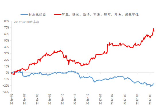 再看中国互联网领域的独角兽(阿里、腾讯、微博、京东、陌陌、网易、携程),他们的市值在过去一年增长了70%,与之对应的在国内上市的在各个垂直行业(特别是科创领域)不那么具有领先性的这一批中小市值公司在过去一年内下跌近30%,这两者出现了明显的分化。
