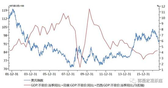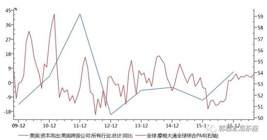 我们用中国、印度、巴西实际增长率拟合为一个新兴市场指数,可以发现它与美元指数之间大致呈一个负相关的关系。美国跨国公司资本流出与全球经济表现也有一定正相关特征。