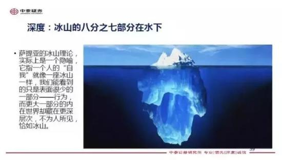 第三点,就是深度,看问题要入木三分。就像冰山,冰山的水下部分占到7/8,我们看到露在水面上的只是它的1/8。只有不断深入研究,才能看到更多的问题,看得更透彻,我一直强调做研究要入木三分也是这个道理。