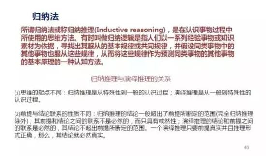 归纳法就是从特殊到一般,我们可以用大数据归纳来分析出共性的东西。归纳法的运用很广泛,比如,茅台酒价格上涨和澳门博彩业收入上涨是否存在相关性?与挖掘机的销量增加是否有相关性?这种相关性背后的逻辑关系是什么?这个背后的原因可以根据更长期的历史来做相关性分析,可能与房地产的销售额上升相关性更高,这也属于归纳法的应用案例。