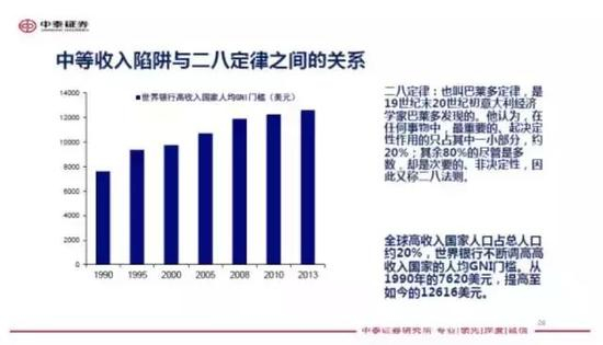 提一个问题,中国能否跨越中等收入陷阱?也就是中国能不能步入高收入国家的行列?我用“二八定律”来分析:高收入国家(地区)的人口总量占全球的20%,中国的人口在全球的占比也是20%。中国现在是中高收入国家,如果中国也成为了高收入国家,意味着高收入国家人口将至少占到全球人口的20%以上(除非其他国家都不属于高收入),这显然不符合高收入国家的标准。高收入国家人口只能占到全球人口的20%,否则就不叫高收入国家。世界银行把国民收入分成五档,高收入、中高收入、中等收入、中低收入、低收入,如果中国要成为高收入国家,那么,美国、日本、欧洲就要退而成为中高或中等收入国家,从目前来看还不大现实。有人可能会说,人均国民收入超过12616美元,便可跨过高收入国家的门槛了。可是,当你要跨过这个门槛的时候,这个门槛又提高了,要知道上世纪80年代的时候,人均国民收入超过7千就算高收入国家了。 “二八定律”始终在发生作用。