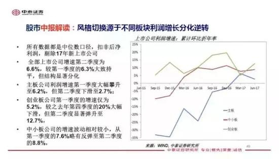 按照上述方法,我们得到的结论是:今年第二季度主板上市公司的盈利增速是下降的。而大多数人的观点是,今年第一、二季度主板走势非常强,创业板不看好。尽管创业板在第一季度盈利增速是下降的,但第二季度盈利增速回升。