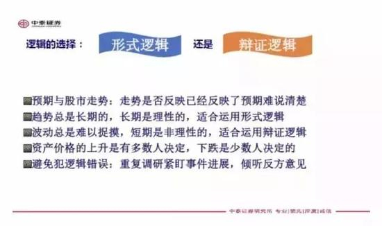 辩证法是国人最擅长的思维方法,如物极必反、分久必合、合久必分等。股市从短期波动来看,也符合辩证法,涨多了要跌、跌多了要涨,我们非要寻找涨了是什么原因,跌了是什么原因,何苦呢?跌的原因就是因为涨多了嘛,涨的原因就是因为跌多了嘛,其实很简单。我认为对股市的长期分析要用形式逻辑,即成长性决定股价,所以要用演绎法,短期波动用辩证法。