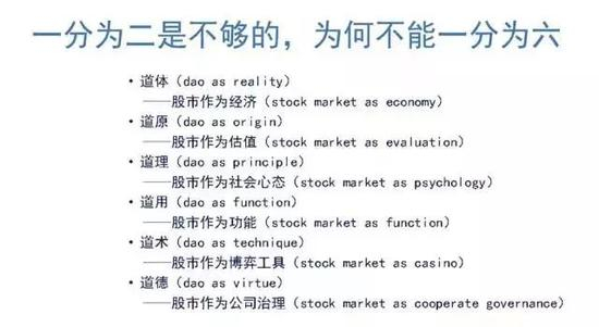 台湾有个研究诠释学的学者叫傅伟勋,他对“道”的诠释很到位,提出“道”有六义:道体、道原、道理、道用、道术、道德。我在他理论的基础上进行了创新,提出股市的六义:第一,“股市是经济的晴雨表”,对应“道体”。大家都认为,股市是经济的晴雨表,股市好时,经济比较强劲;股市不好时,经济也不景气。我们用股市的表现来对经济趋势进行判断,这没错,但需要了解 “中国特色”;第二,股市发现价值,对应“道原”,券商分析师们要分析股票到底值不值这个钱,要用估值模型来判断;第三,股市作为社会心态的反应,对应“道理”,比如,不少人认为中国马上要召开“十九大”了,故应该去买些股票,因为预期“十九大”结束之前股市不会跌;第四,股市体现功能,对应“道用”。对于监管层也好,对于上市公司也好,股市要为社会发展所用,所以,要发展股市直接融资功能;第五,“股市作为博弈工具”,对应“道术”。吴敬琏先生说,股市就是赌场。中国股市作为博弈工具的功能被发挥得淋漓尽致,2015年A股交易量占到全球的1/3;从第六个角度看股市,它是“道德”,股市会促进公司治理结构的完善。交易所专门设了一个公司治理指数,把公司治理较好的股票做了一个组合,看它能不能跑赢市场。