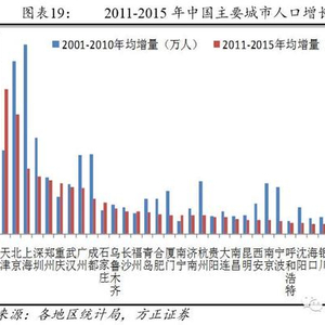 在城市层面,人口向一线城市和区域中心城市集聚速度整体放缓,且分化明显,但趋势未改。2011-2015年间,除天津、重庆(主城9区)、石家庄、南宁和福州外,其他城市常住人口年均增量较2001-2010年均有不同程度的减少。其中,天津、重庆(主城9区)常住人口年均增量较之前明显增加,重庆(主城9区)常住人口年均增量从之前的13.0万增至17.8万;石家庄常住人口年均增量从之前的8.2万增至10.8万,南宁从之前的4.5万增至6.5万,福州从之前的7.3万增至7.7万;郑州、武汉常住人口年均增量较之前减少不到1万人,继续保持在16-20万人;苏州、南京、宁波等常住人口年均增量大幅减少,分别从之前的35.5万降至3.0万、17.7万降至4.6万、16.4万降至4.4万,苏州可能呈现人口净迁出。