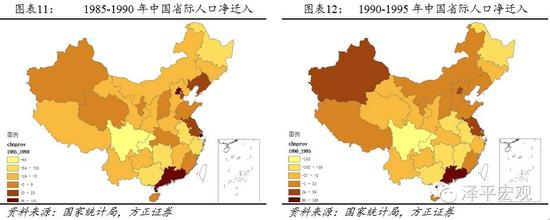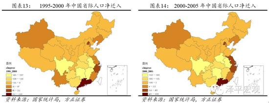 1995-2000年,人口主要迁往珠三角、长三角、京津、新疆、福建等地区,浙江从之前的净迁出变为净迁入。伴随着改革开放深入推进,1990年代中期以来省际迁移人口规模大幅增长。据2000年人口普查资料,1995-2000年省际净迁入人口主要集中在广东(1165万人)、长三角地区(465万人)、京津地区(221万人),三者合计占87.1%。此外,新疆、福建、辽宁和云南也有大量的净迁入人口,分别为97、76、39、35万人。净迁出人口主要来自四川(401万人)、湖南(305万人)、安徽(272万人)、江西(257万人)、河南(194万人)、湖北(169万人)、广西(163万人)、贵州(102万人)、重庆(69万人)、黑龙江(67万人)等地。