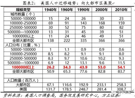 1、美国日本人口迁移呈两大阶段:第一阶段,人口从农村向城市迁移,一二线和三四线城市都有人口迁入,这可能跟这一阶段产业以加工贸易、中低端制造业和资源性产业为主有关。第二阶段,人口从农村和三四线城市向一二线大都市圈及卫星城迁移,三四线人口面临迁入停滞,大都市圈人口继续增加,集聚效应更加明显,这可能跟产业向高端制造业和现代服务业升级,以及大都市圈学校医院等公共资源富集有关。值得注意的是,在第一阶段到第二阶段过程中,会出现短期的大都市圈向区域中心城市回流现象,但不改变大的趋势。这也就是意味着,控制大城市人口、中小城镇化战略和大规模西部造城运动可能是不符合人口迁移规律的,而且大城市比小城市更有效率、更有活力、更节约用地、更节约资源。