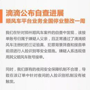 空姐遇害事件发生之后,公众开始质疑滴滴平台对顺风车审核不严的问题。滴滴公司在昨日公布自查结果,承认平台存在监管漏洞,宣布顺风车平台业务全国停业整改一周。该嫌疑人系违规使用其父的顺风车账号接单,在案发前就因言语性骚扰而被投诉,但滴滴并未对投诉做妥善处理。