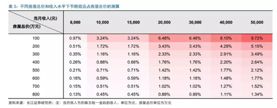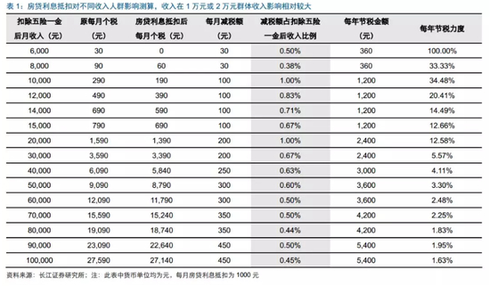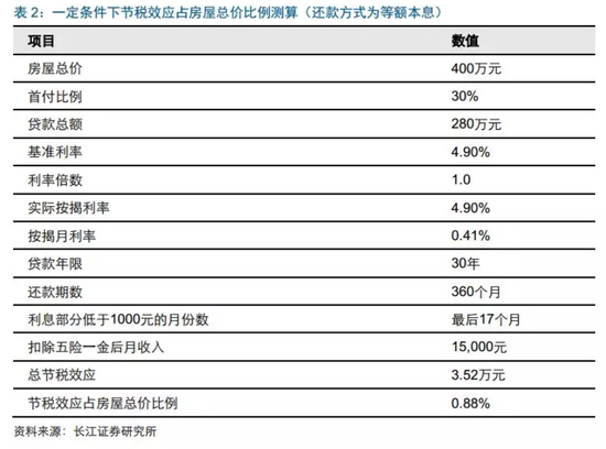 长江证券测算,房屋总价越低、扣除五险一金后月收入越高,则节税效应越高。 当前房价下,住房贷款利息专项附加扣除每月1000元上限相对较低。