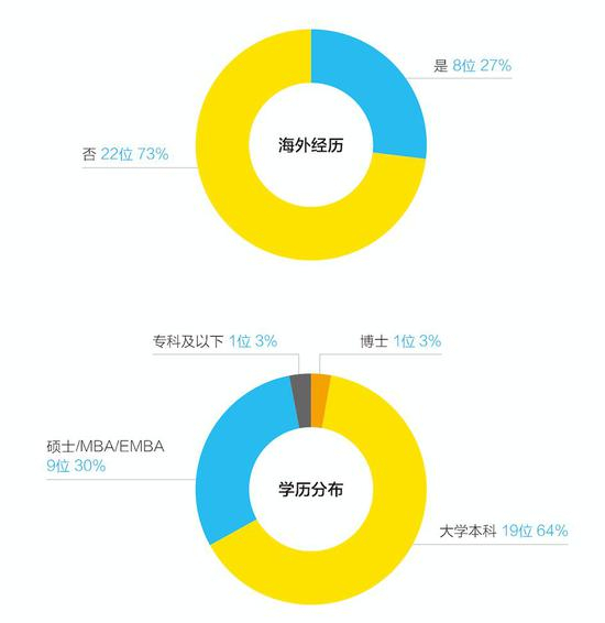 从学历分布来看,本次上榜的30新贵呈高学历趋势。其中,只有1人为专科及以下学历;大学本科占比最多,共19人;硕士/MBA/EMBA有9人;博士1人。在30位新贵中,有8人拥有海外留学或工作经历的背景。