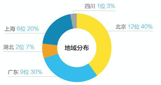 从地域分布来看,北上广以绝对优势遥遥领先,共计27家,占比九成;另有湖北2家,四川1家。