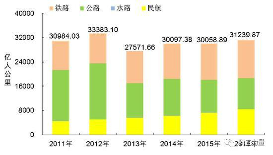 笔者的这种观点也能得到数据的支撑,根据《2016年交通运输行业发展统计公报》中对几种交通方式旅客周转量的对比,我们不难清晰地看出中国铁路的客运周转量是靠与公路运输竞争中争取过来的。虽然在下图中民航的客运周转量是一直在上升的,但是我们都知道选择民航出行的旅客和区间一般是不会同时和公路发生交集的。