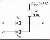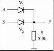 三角形代表二极管,箭头方向表示电流可通过的方向,AB是输入端,F是输出端。如果A不加电压,电流就会顺着A那条线流出,F端就没了电压;如果AB同时加电压,电流就会被堵在二极管的另一头,F端也就有了电压。假设把有电压看作1,没电压看作0,那么只有从AB端同时输入1,F端才会输出1,这就是“与门电路”。